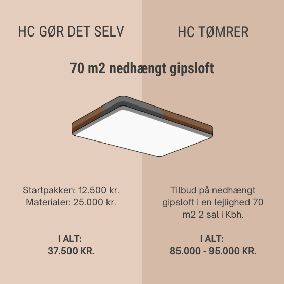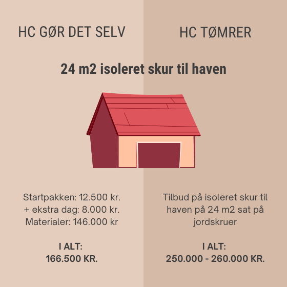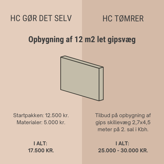 Sammenligningen er baseret på vores Gør Det Selv: Startpakke og et tilbud på samme opgave fra vores tømrerfirma HC Tømrer.